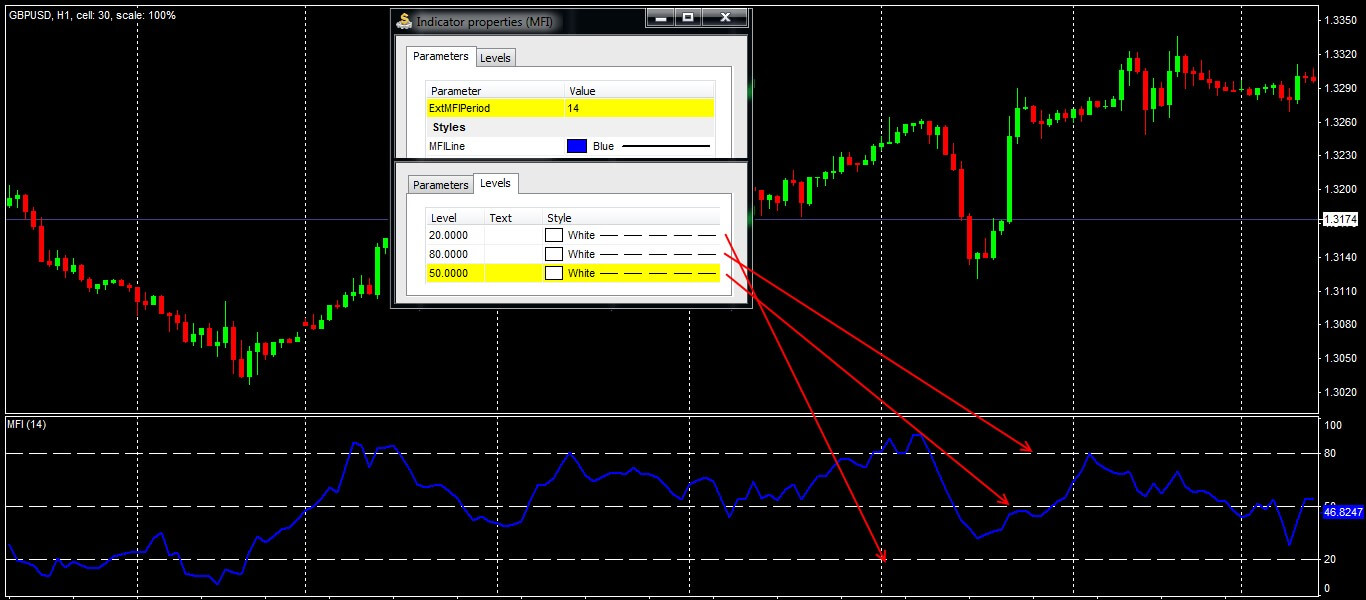 Of course, you cannot see the real amount of the money in open positions on Forex, but even the available data on the number of transactions (tick volume) allows MFI to give stable results.