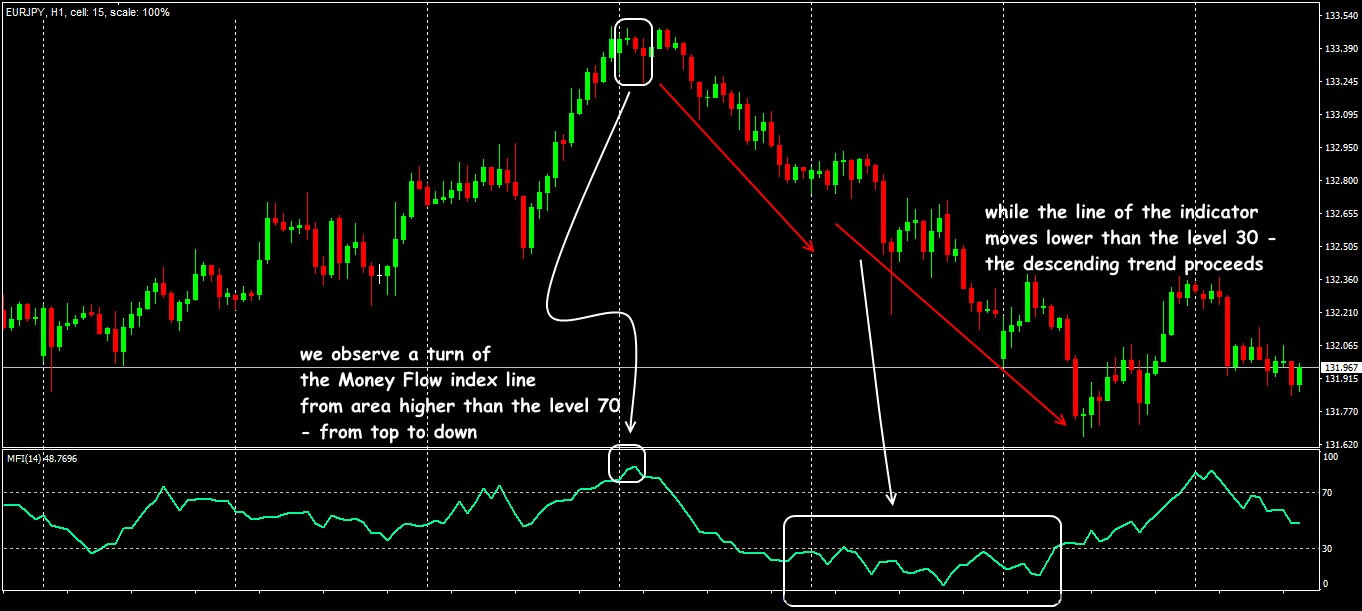 The Money Flow Index indicator demonstrates the distribution of forces bulls/bears, and also possible changes of the market situation in the nearest future. You should not forget that it was initially developed for the stock market where there is much more information for forecasting.