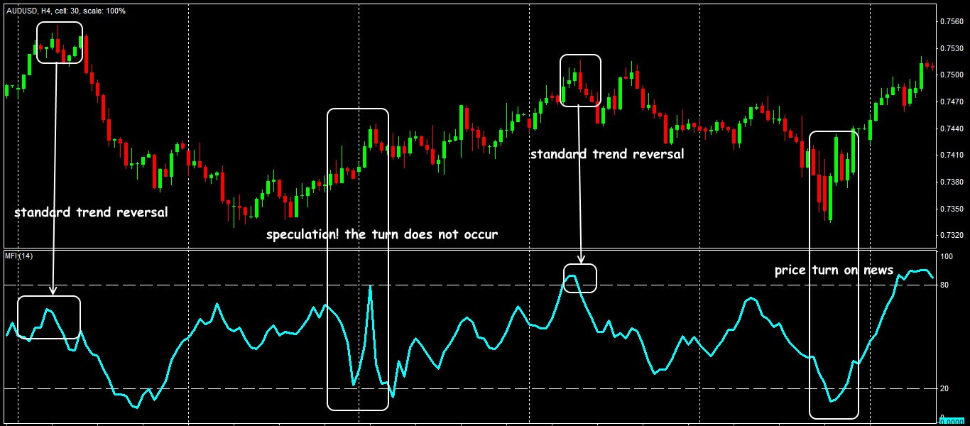 In practice, divergence on MFI is extremely rare. As a rule, the indicator gives a warning signal for 3-5 bars before a real turn.