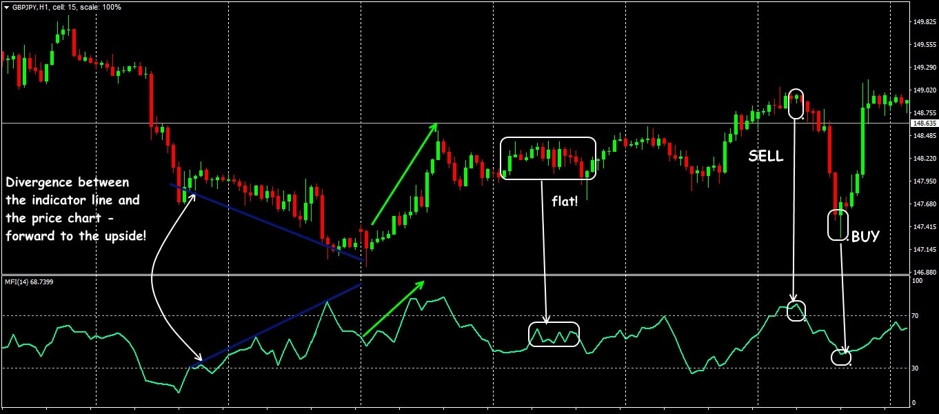 Indicators are required: MFI (6) with levels (30/70), SMA (3) on MFI data.