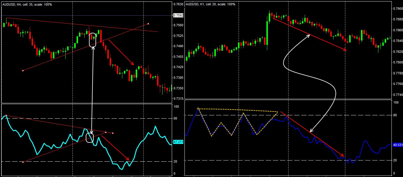 Graphic patterns on the indicator line always outstrip the formation of similar figures on the price chart for several periods.