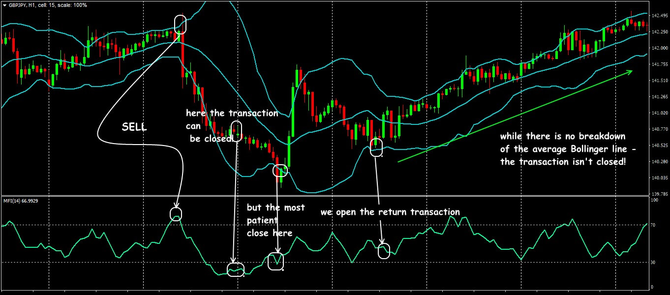 BollingerBands operates as a trend indicator and a filter of a Money Flow Index signals: only purchases with the ascending mid-range BB and only sales − with its fall.