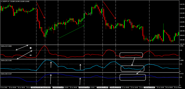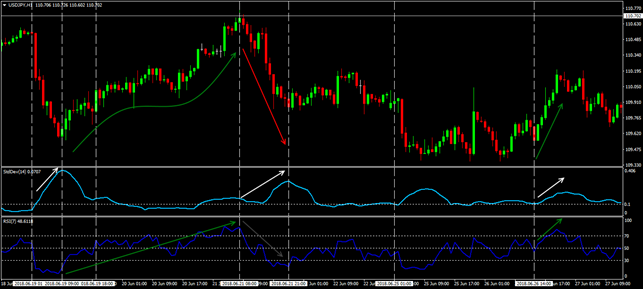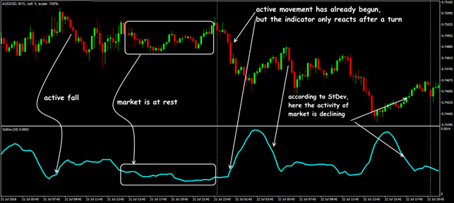 Alone, the StDev indicator is not used, only complete with classic trend tools. More often it is used to find entry points into an already identified trend.
