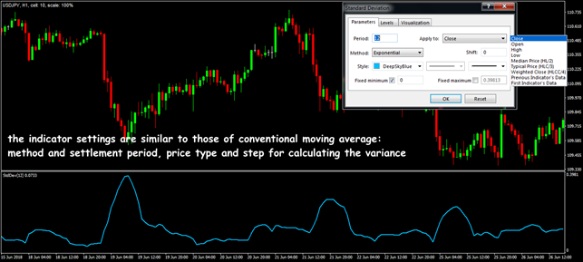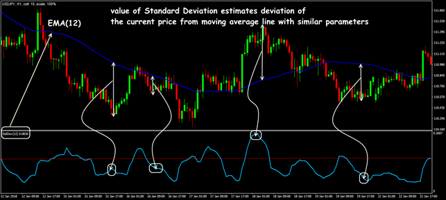 Standard Deviation is not so much an indicator as a function of the standard price deviation. The idea is that the market is considered to be volatile if the price is actively changing relatively to some average value, for which the corresponding moving average is chosen in Standard Deviation. If the market is in a flat, then the bars prices are fairly close to the moving average, and volatility is considered low (see Standard Deviation − Explained and Visualized).