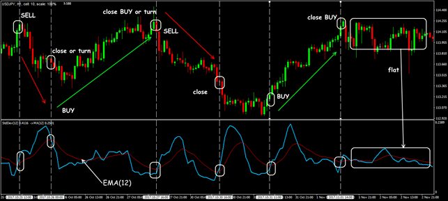 The indicator can be used as a trend filter in a strategy with oscillators − in case of breakdown of the line flat, the transaction opens in the direction of the trend. For example, in the StDev+RSI system, the trend indicator will be StDev, and the trading signal − RSI indicators in the direction of Standard Deviation.