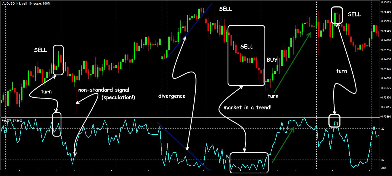 The Williams Percent Range compares each closing price with the last trading range, and evaluates the probability of one of two events: either the buyers will “stop” the price to the maximum of the range, or after all bears will be stronger and the market will be closed closer to the minimum price (see How To Use The Williams % Range).