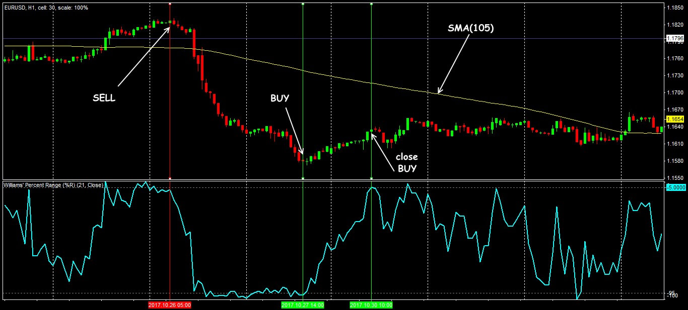 imilarly, effective can be a strategy with a moving average (we need a simple one with a period of 105) and WPR (21) with levels (-95) and (-5). While the price is higher than the SMA (105) − only buy, if the price is lower − only sell. The result?
