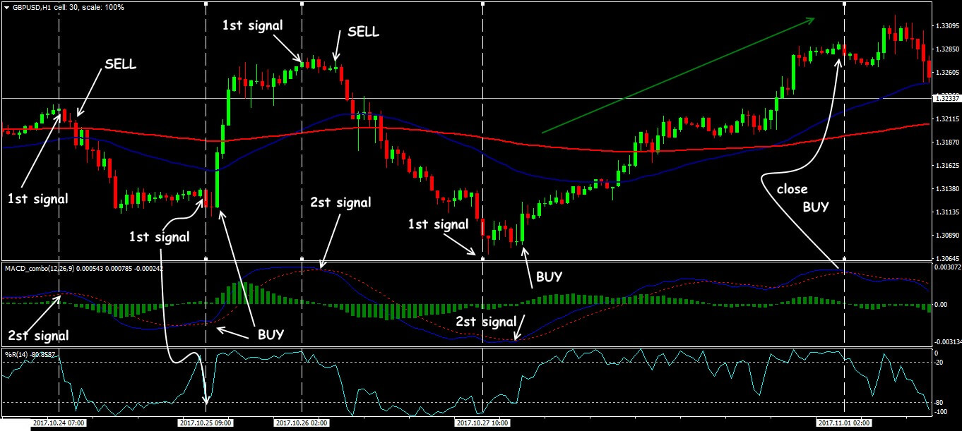 Scheme of trade signals Williams%R+SMA+MACD