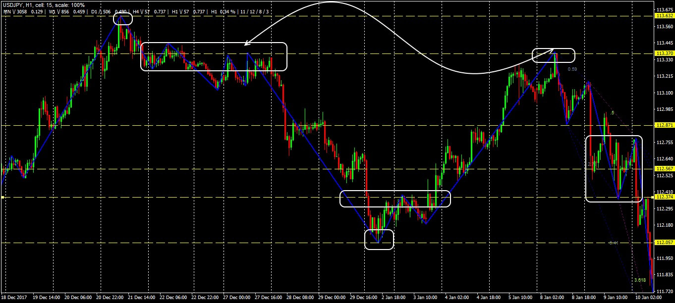 From this point of view, we recall: indicator ZigZag allows «redrawing» entire graphic design with strong price rolls. The last (forming) section can change its direction and length depending on the current price changes. This can be a serious problem for short-term trading.