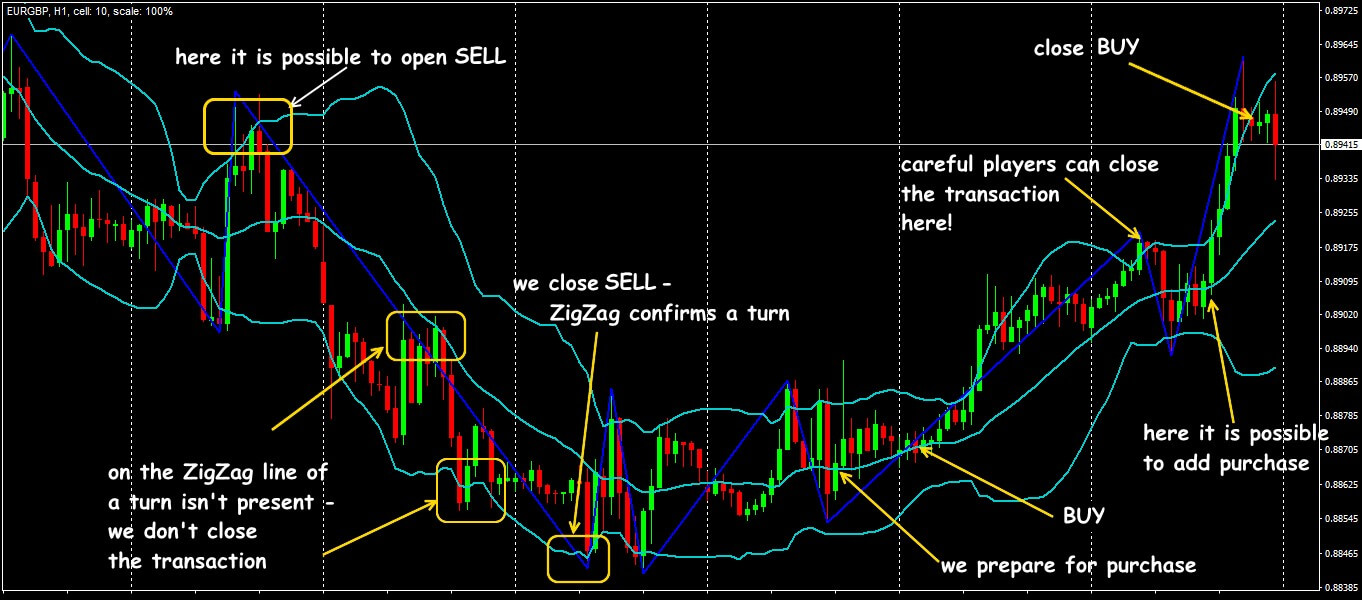 In the trend strategies, the ZigZag is always used as a trend definition tool, so it works fine with the price channel indicators such as Bollinger Bands: